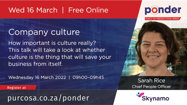 The recording of our PURCO SA Ponder online event on March, with Sarah Rice is available for viewing. Sarah shared valuable insights into the importance of Company Culture, taking a look at whether culture is the thing that will save business from itself or if it just a whimsical millennial idea like mental days and needing a purpose.