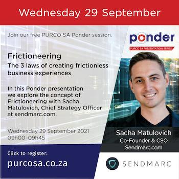 The recording from our PURCO SA Ponder online event on 29 September is available. Our topic for the event was "FRICTIONEERING", and explored how creating frictionless experiences can improve your business and delight your customers and co-workers. Our guest speaker was Sacha Matulovich, Chief Strategy Officer for sendmarc.com.
