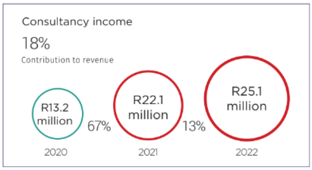 Revenue from consulting projects increased by 13% from the prior year’s R22.1 million to R25.1 million in 2021-2022.