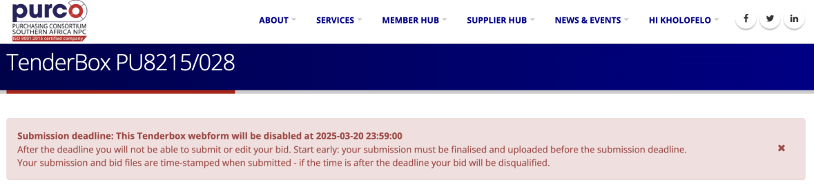 - Log in to purcosa.co.za as the user who purchased the tender
