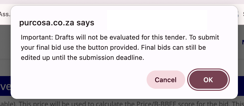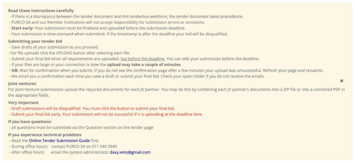 - A copy of your submitted data is also sent to a secure, unmanned PURCO SA mailbox as a backup for audit purposes. This backup mailbox is not accessible by tender administrators or bid committees.