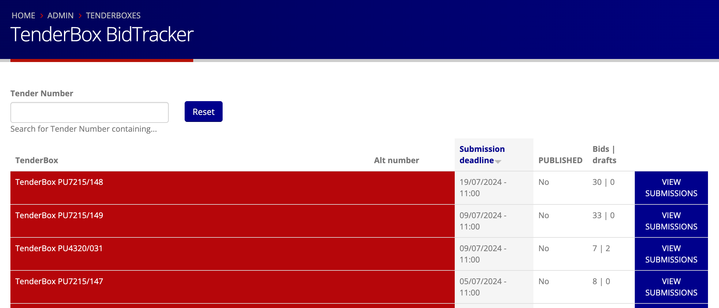The BidTracker page makes it possible to see a list of submissions that have been made (including drafts) for a TenderBox that has not yet reached its submission deadline.