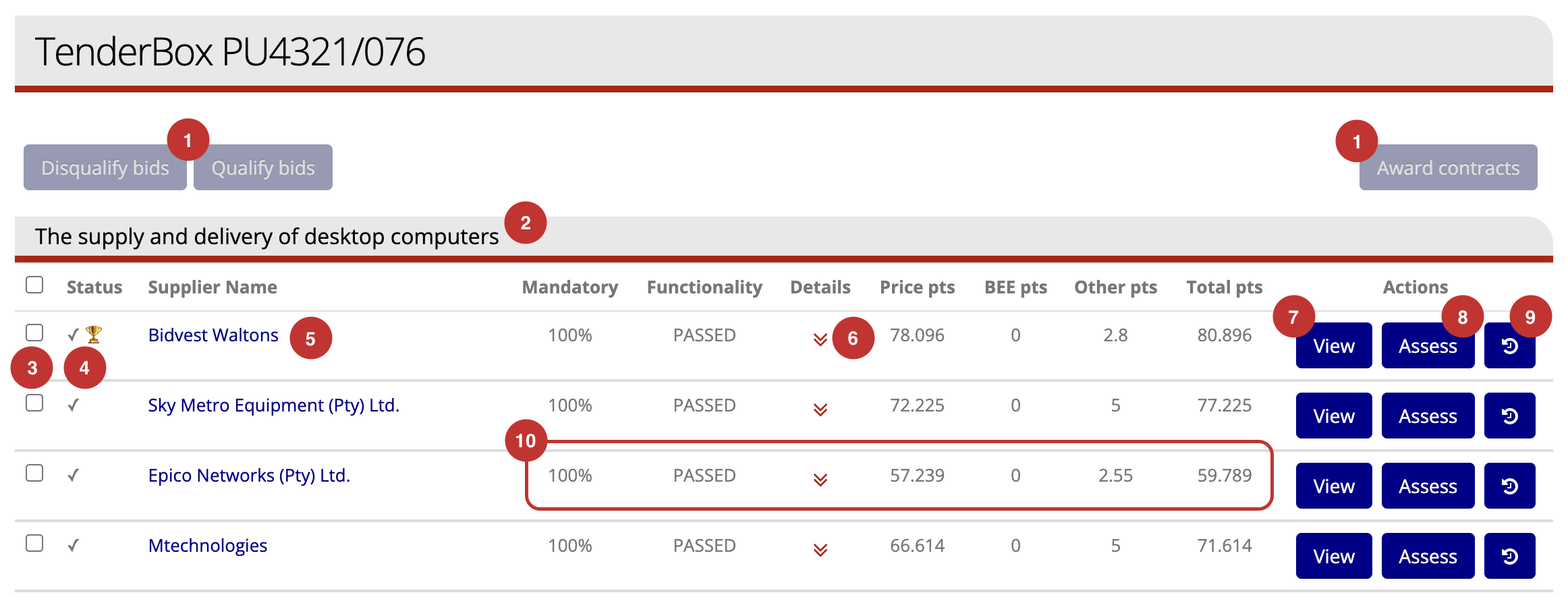 - Action buttons (Assessors Only): These will become enabled when at least one of the bid submissions in the list has been selected by checking the selection checkbox (3), they can be used to disqualify bids, qualify bids, or award contracts (see Awarding Contracts).
