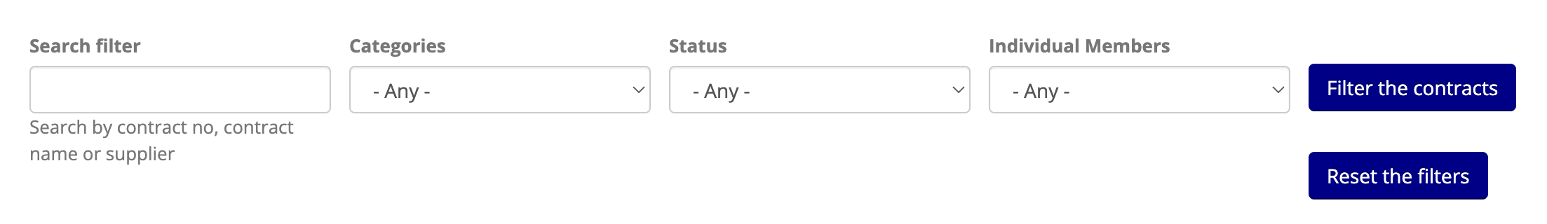 NOTE: Filters requiring text input will match contracts that contain the provided text for the specified field, i.e. you may provide only part of the Supplier name (for example) without needing to type the complete name.