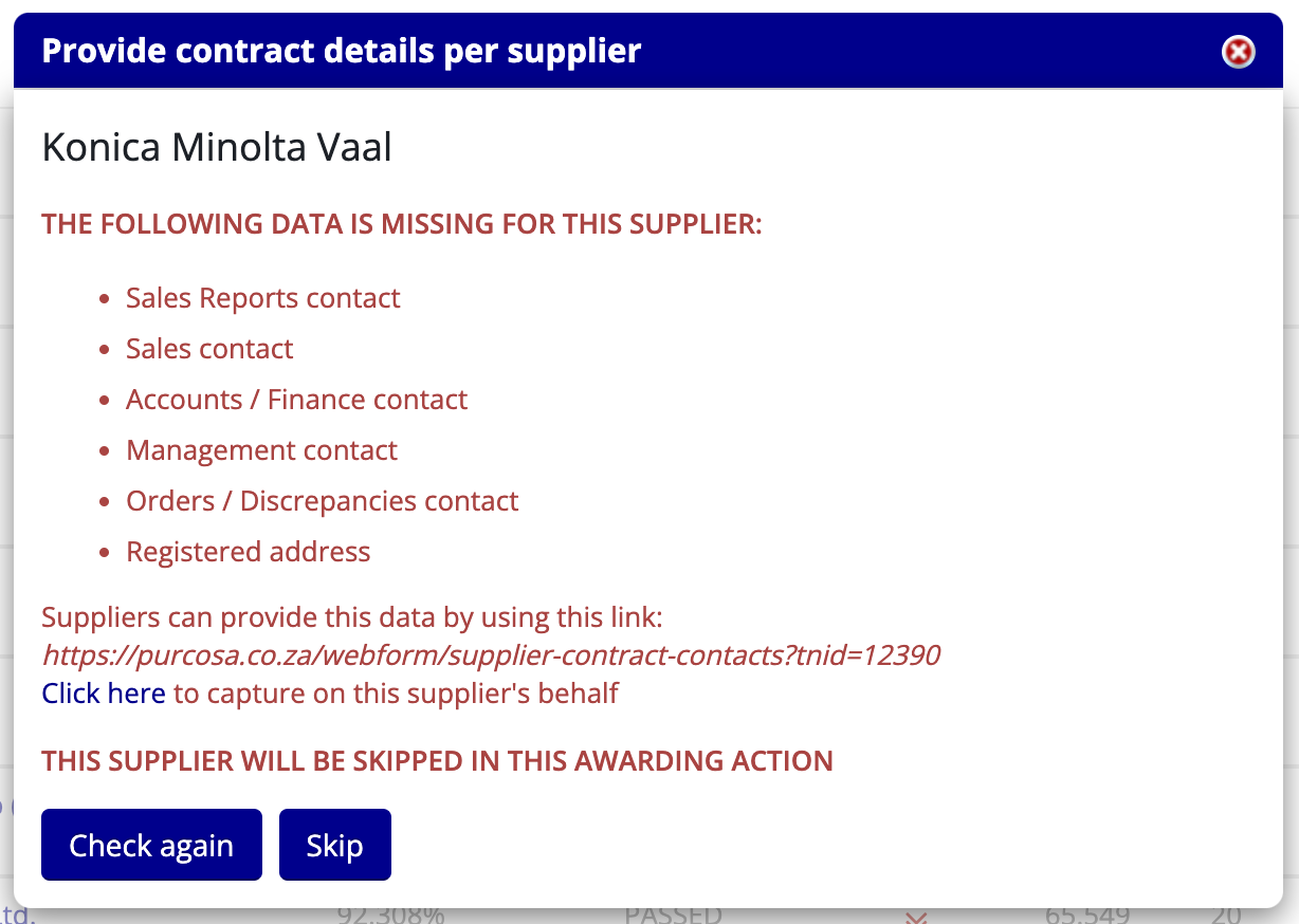 - The Skip button can be used to skip this supplier and proceed with the next supplier selected for this contract awarding process.