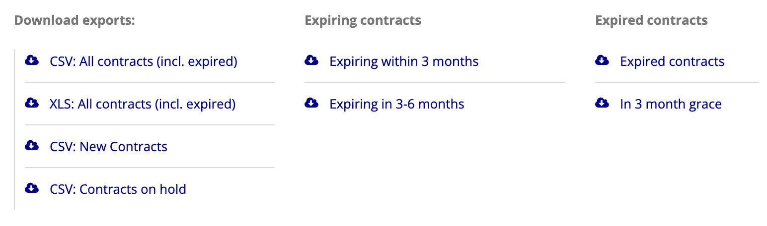 Once you have filtered the list of contracts appropriately, click the XLS to download an export of only the filtered list of contracts.