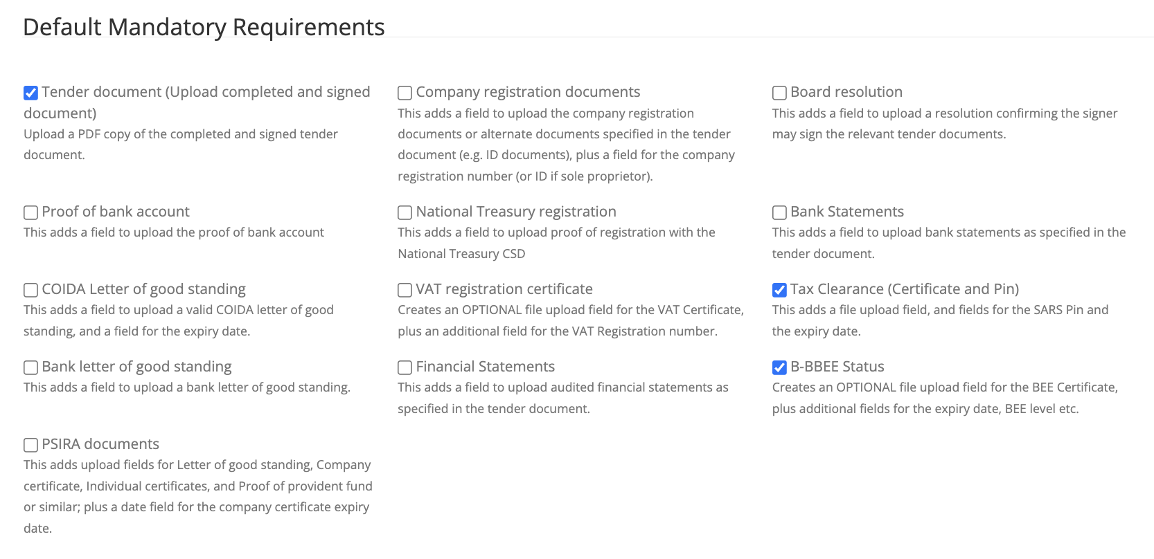 Select which of the Default Mandatory Requirements presented should be included in this TenderBox. The requirements selected here will be included in the form provided for bidders regardless of which component/s are selected. It is important to make use of these rather than to create custom Mandatory Requirement Sets to serve the same purpose. The "B-BBEE Status" requirement here for example, will ensure that B-BBEE information captured from the bidder is added to their organisation record in the CRM system, and even more importantly, usable by the scoring system when a component is configured to consider B-BBEE Level.
