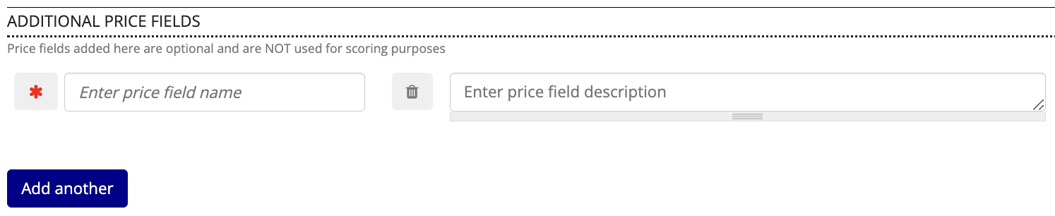 Here you can provide names and descriptions for additional price fields to be included in the TenderBox, as well as set whether each one is required or optional. Note that values provided by bidders for these fields are not used in any way by the scoring system.