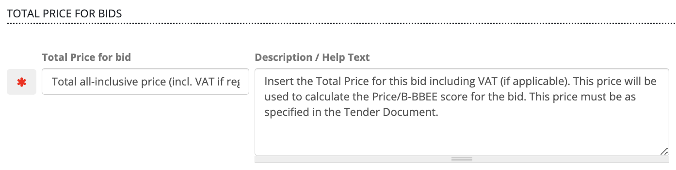 By default the total price field is set as 'required' (indicated by the red asterisk), meaning the bidder will not be able to make a final submission without providing a total price. The label and description for the total price field can be adjusted here if necessary.