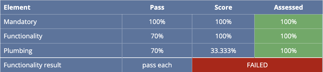 For the Functionality result row, the last table cell spans across both columns (2 and 3 above), and reflects the overall status - PASSED (in a green cell) or FAILED (in a red cell).