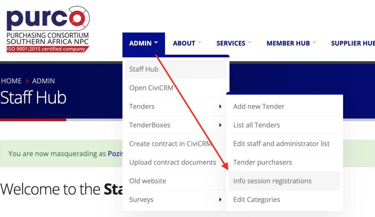 Navigate to the Admin section on the site, hover over Tenders and select Info session registrations from the dropdown.